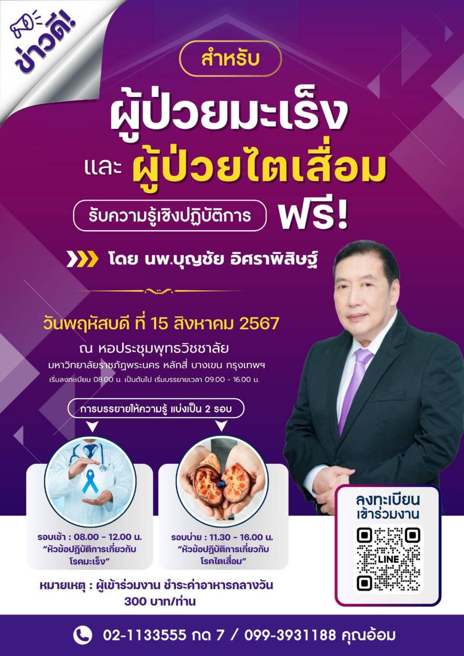 วิทยากรให้ความรู้โดย นพ.บุญชัย อิศราพิสิษฐ์ ผู้มีประสบการณ์ในการดูแลผู้ป่วยทั้ง 2 กลุ่มโรค มายาวนานกว่า 8 ปี มีผู้ป่วยที่ผ่านการดูแลมากกว่า 10,000 คน ด้วยการแพทย์แผนปัจจุบันผสมผสานกับวิถีธรรมชาติบำบัด