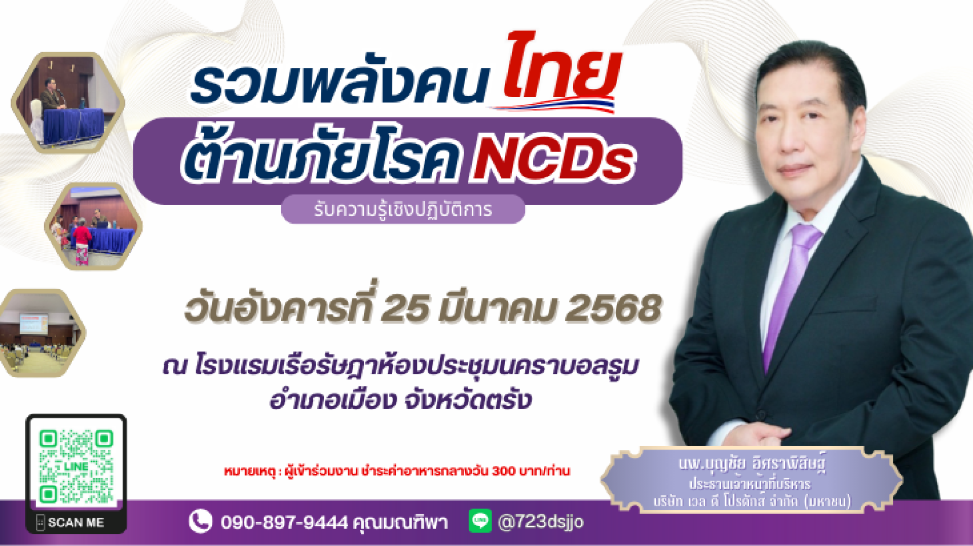 ขอเชิญชวนผู้รักสุขภาพ หรือ ผู้ที่สนใจเข้าร่วมฟังบรรยายให้ความรู้เชิงปฏิบัติการ เกี่ยวกับ "กลุ่มโรค NCDs" โดย นพ.บุญชัย อิศราพิสิษฐ์
